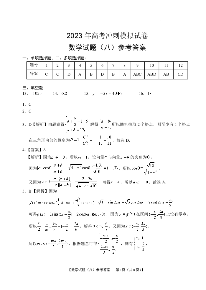 2023届湖北省高考冲刺模拟试卷数学试题(八)答案