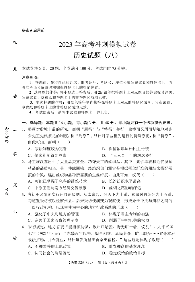 2023届湖北省高考冲刺模拟试卷历史试题(八)