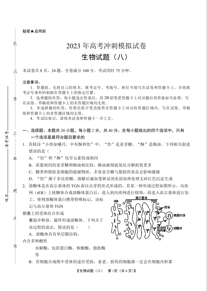 2023届湖北省高考冲刺模拟试卷生物试题(八)