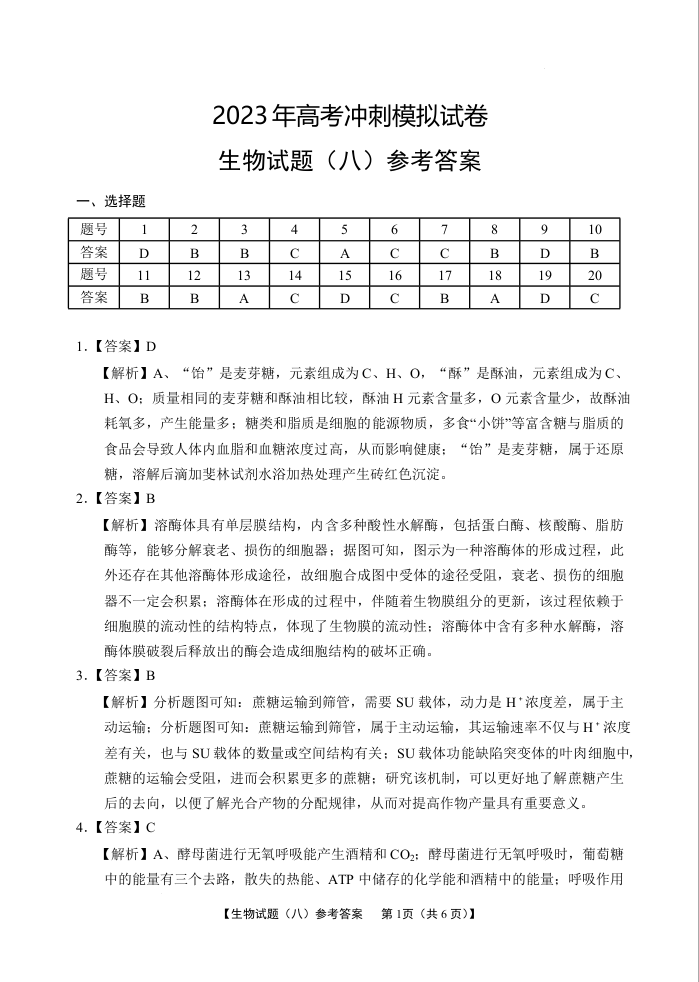 2023届湖北省高考冲刺模拟试卷生物试题(八)答案