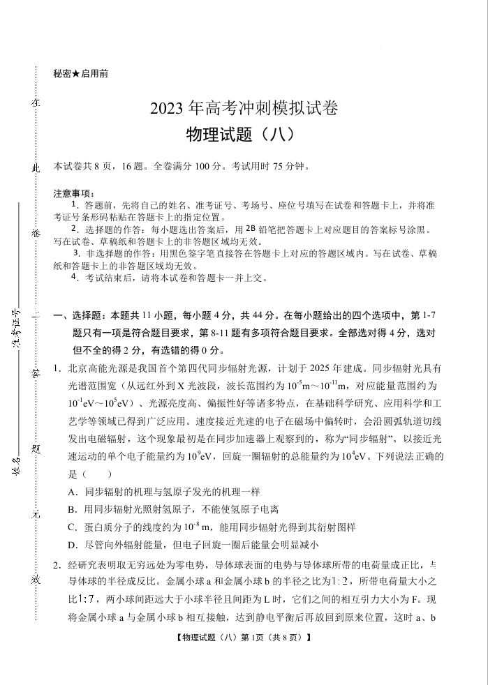 2023届湖北省高考冲刺模拟试卷物理试题(八)