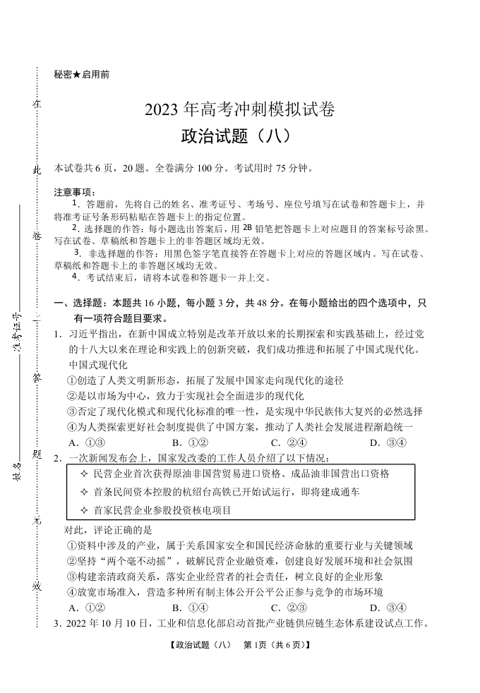 2023届湖北省高考冲刺模拟试卷政治试题(八)