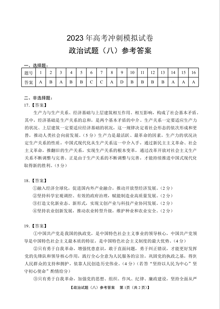 2023届湖北省高考冲刺模拟试卷政治试题(八)答案