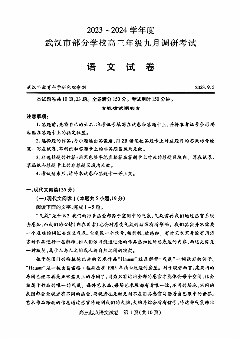 湖北省武汉市2024届部分学校高三年级九月调研考试+语文