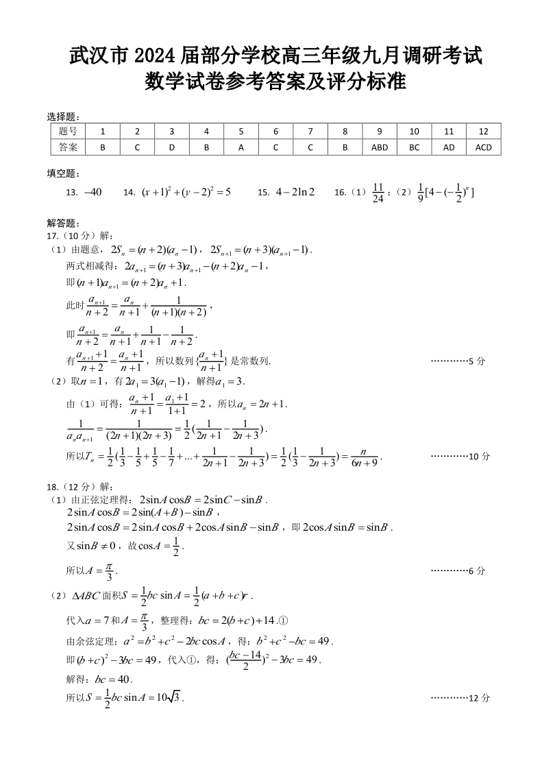 湖北省武汉市2024届部分学校高三年级九月调研考试+数学答案