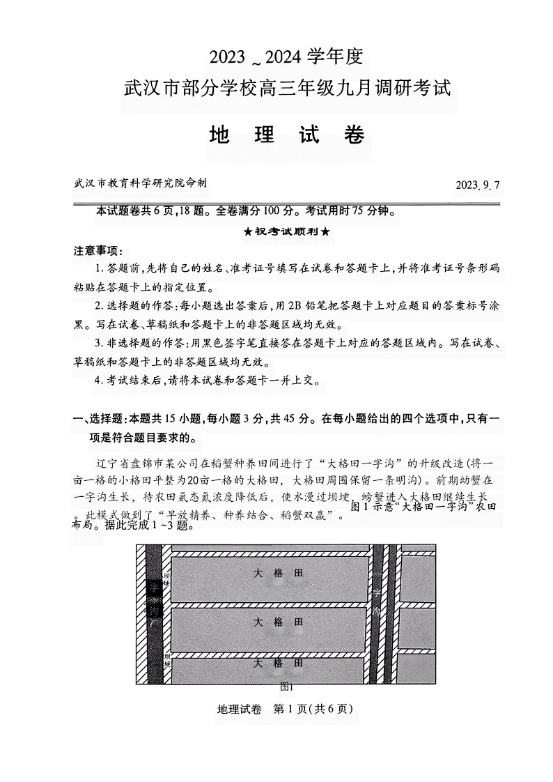 湖北省武汉市2024届部分学校高三年级九月调研考试+地理