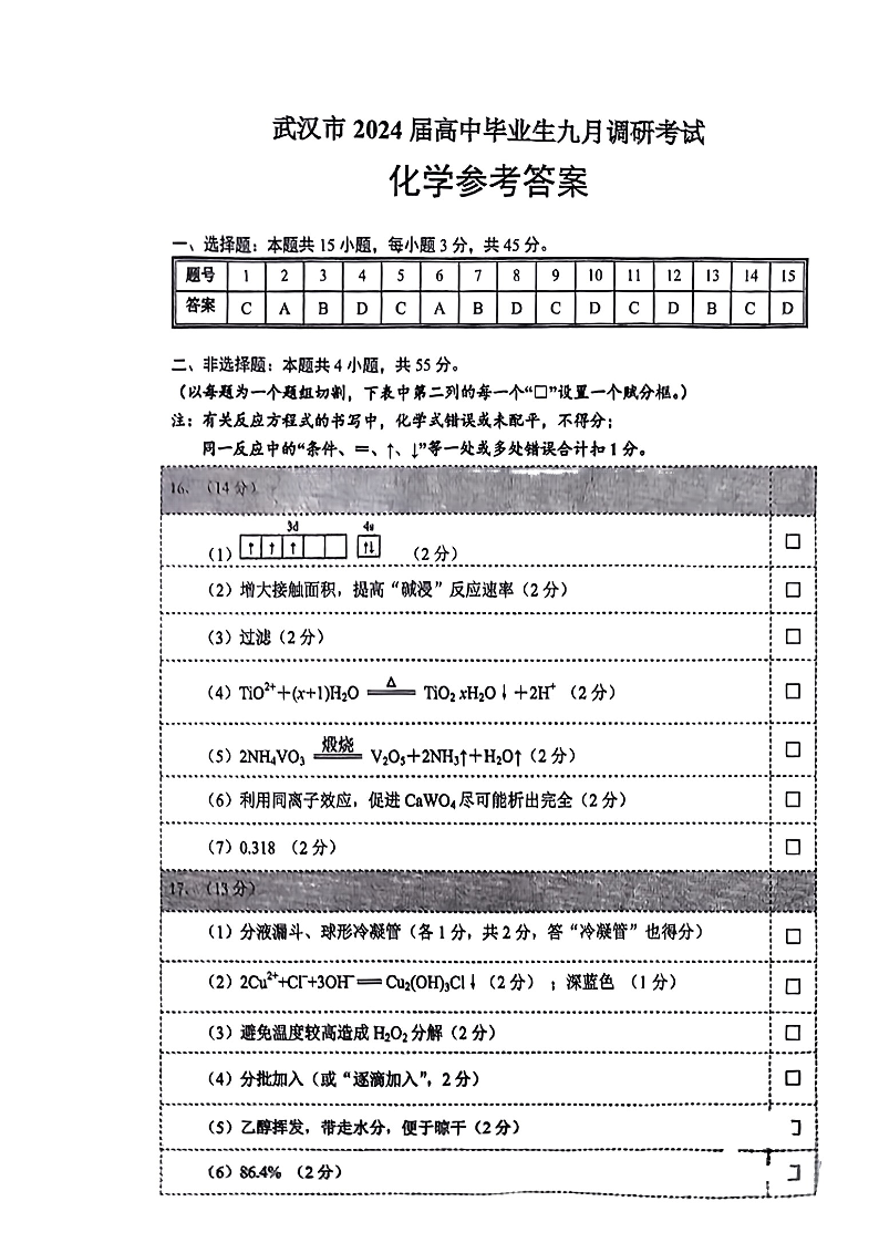 湖北省武汉市2024届部分学校高三年级九月调研考试+化学答案