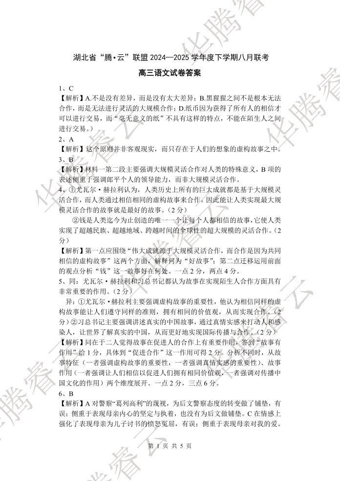 湖北省“腾·云”联盟2025届高三上学期八月联考+语文答案