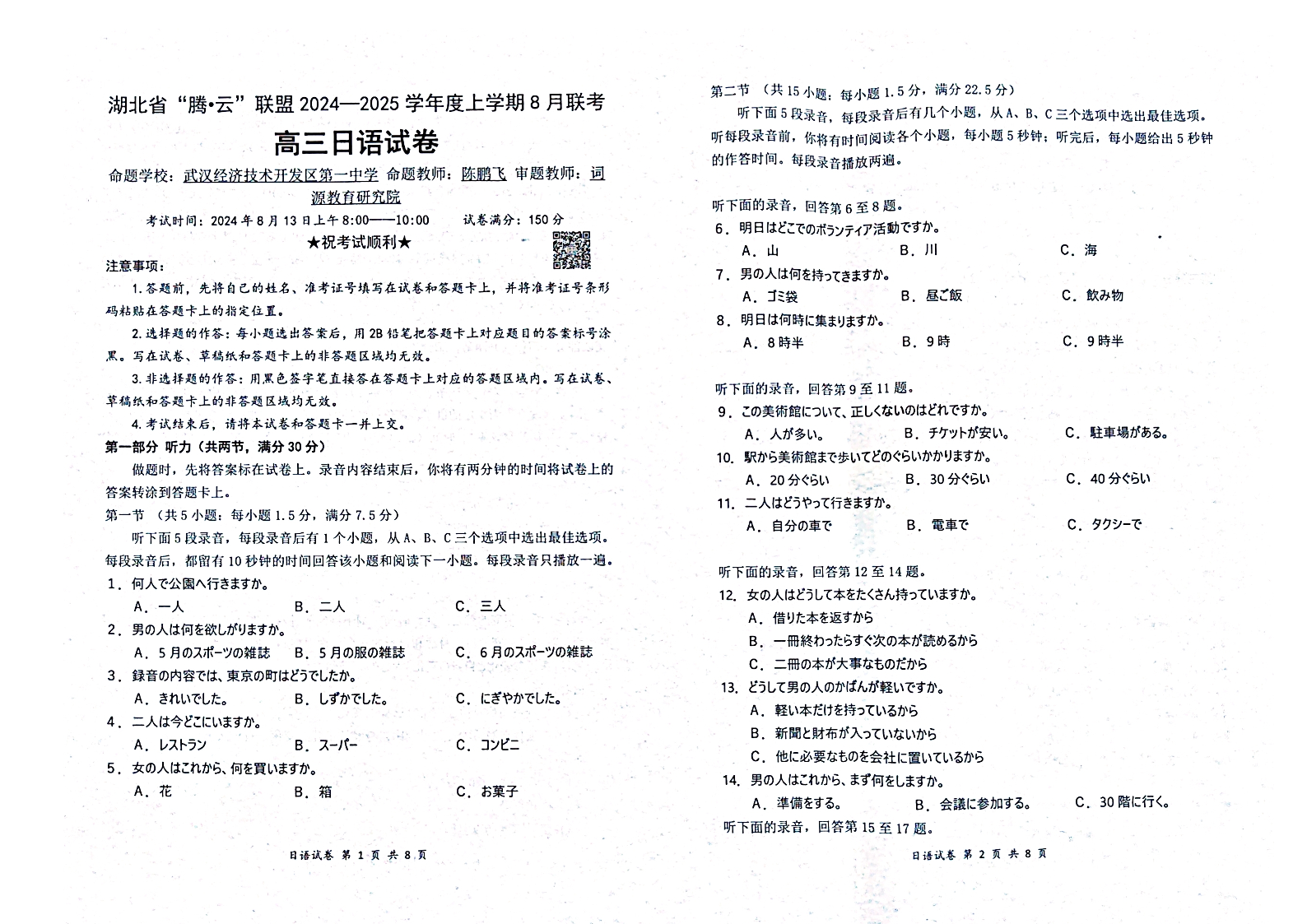 湖北省“腾·云”联盟2025届高三上学期八月联考+日语