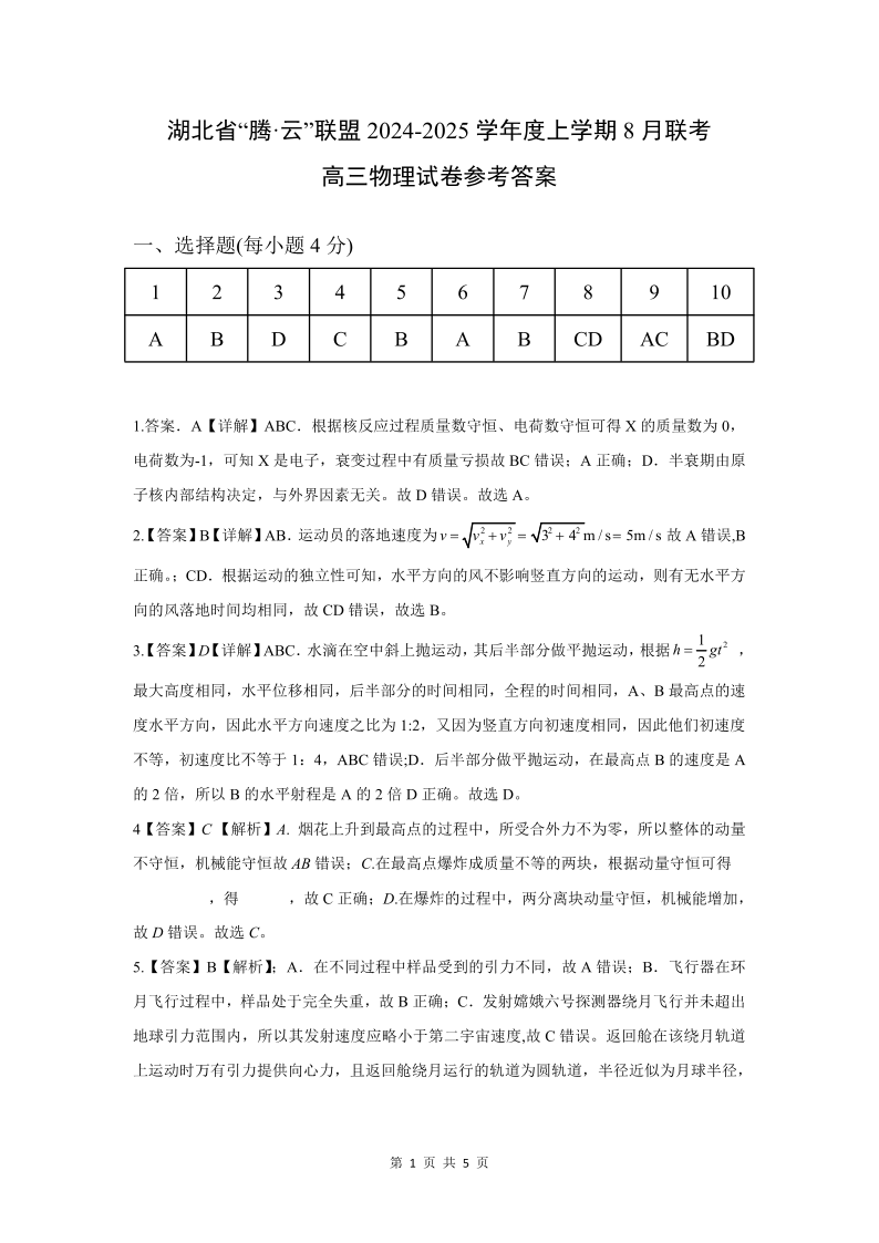 湖北省“腾·云”联盟2025届高三上学期八月联考+物理答案