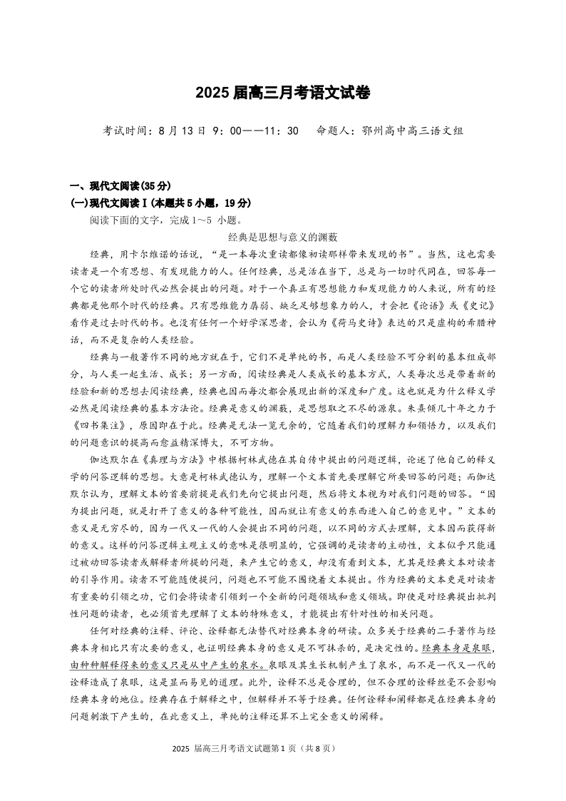 湖北省重点高中智学联盟2025届新高三8月联考考试+语文
