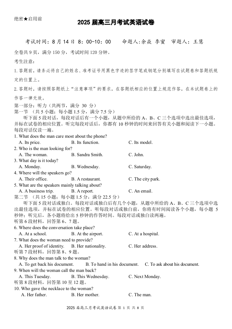 湖北省重点高中智学联盟2025届新高三8月联考考试+英语