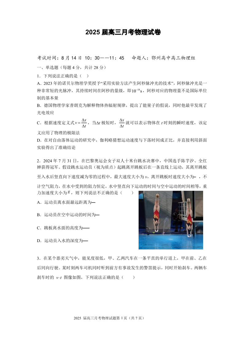 湖北省重点高中智学联盟2025届新高三8月联考考试+物理