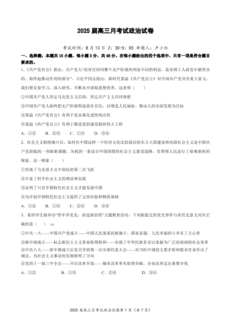 湖北省重点高中智学联盟2025届新高三8月联考考试+政治