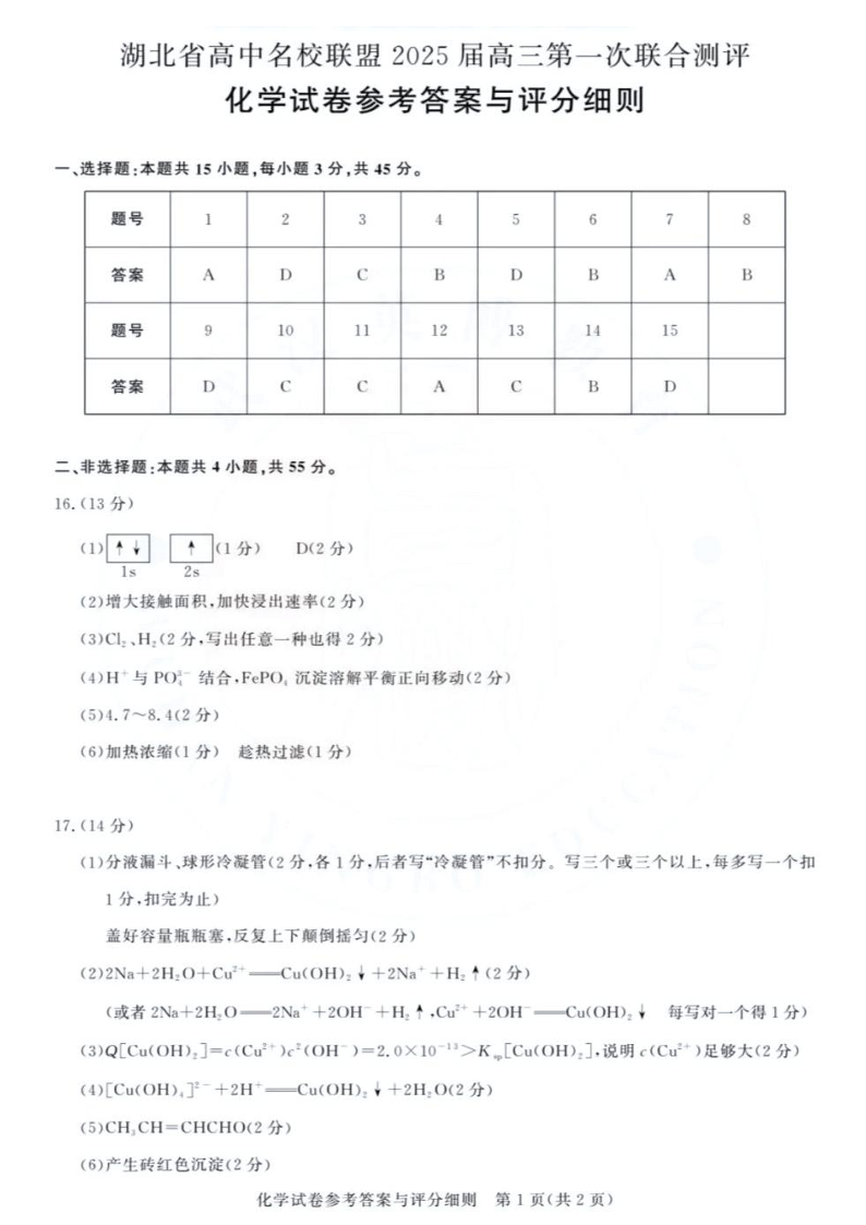 湖北省高中名校联盟2025届高三第一次联合测评+化学答案