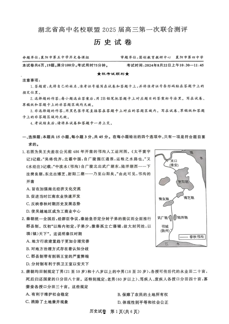 湖北省高中名校联盟2025届高三第一次联合测评+历史