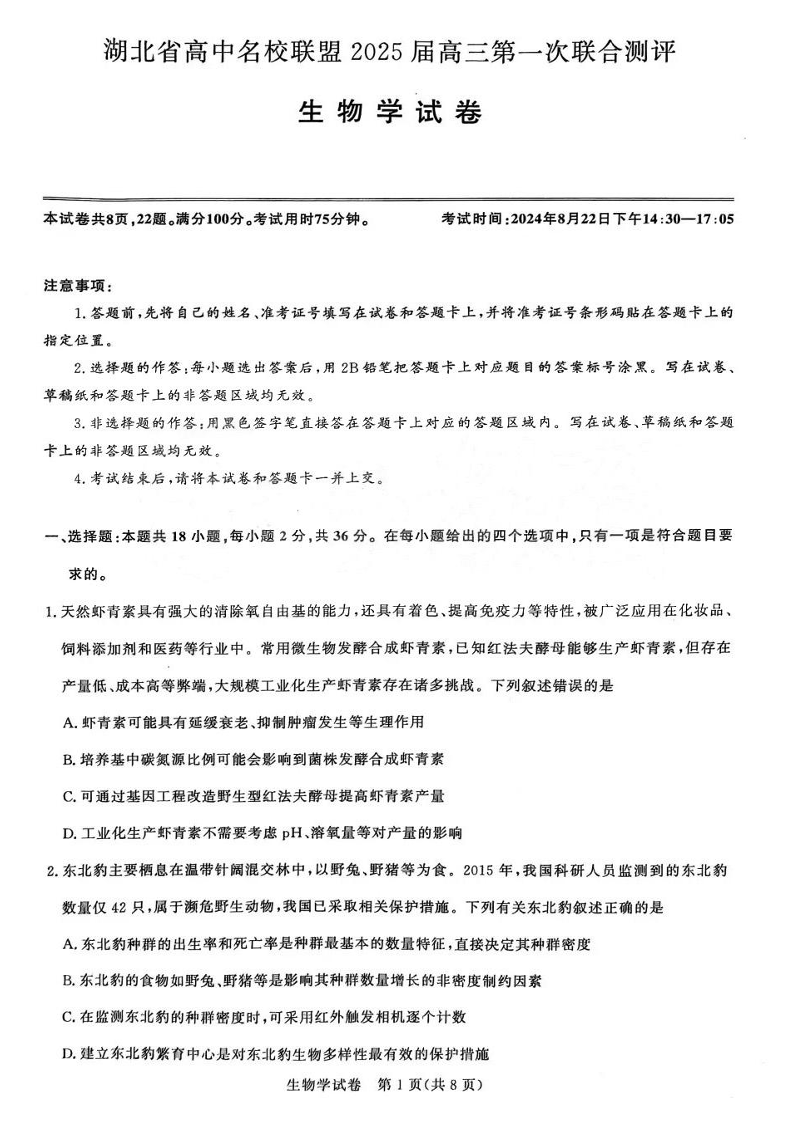 湖北省高中名校联盟2025届高三第一次联合测评+生物