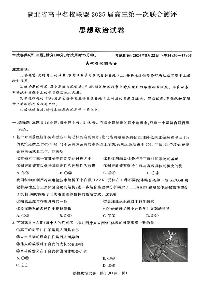 湖北省高中名校联盟2025届高三第一次联合测评+政治