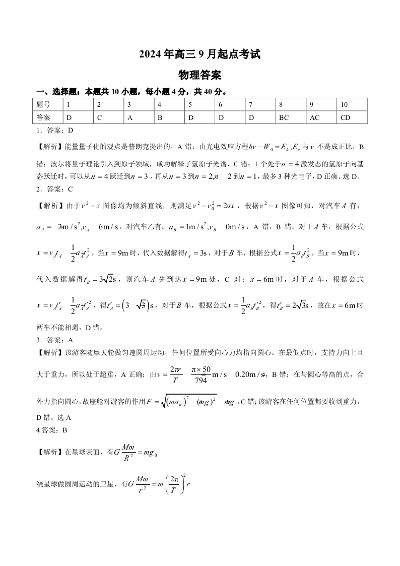 湖北省新高考联考协作体2025届高三上学期开学考试+物理答案
