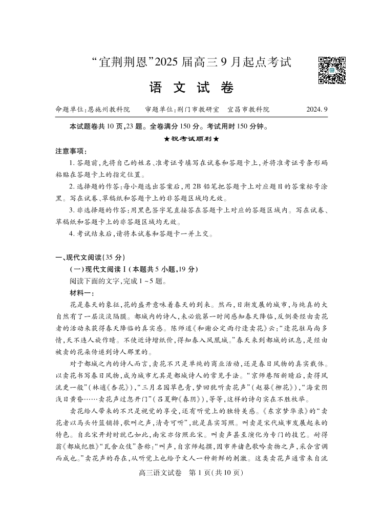 湖北省“宜荆荆恩”2025+届高三9月起点考试+语文