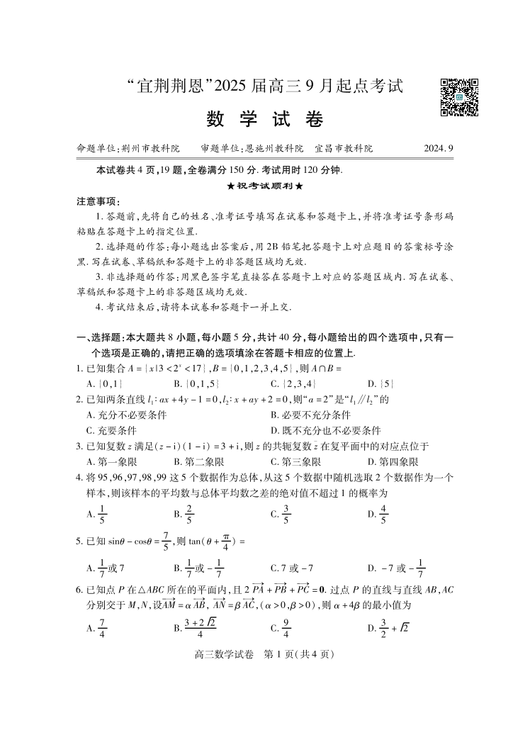 湖北省“宜荆荆恩”2025+届高三9月起点考试+数学