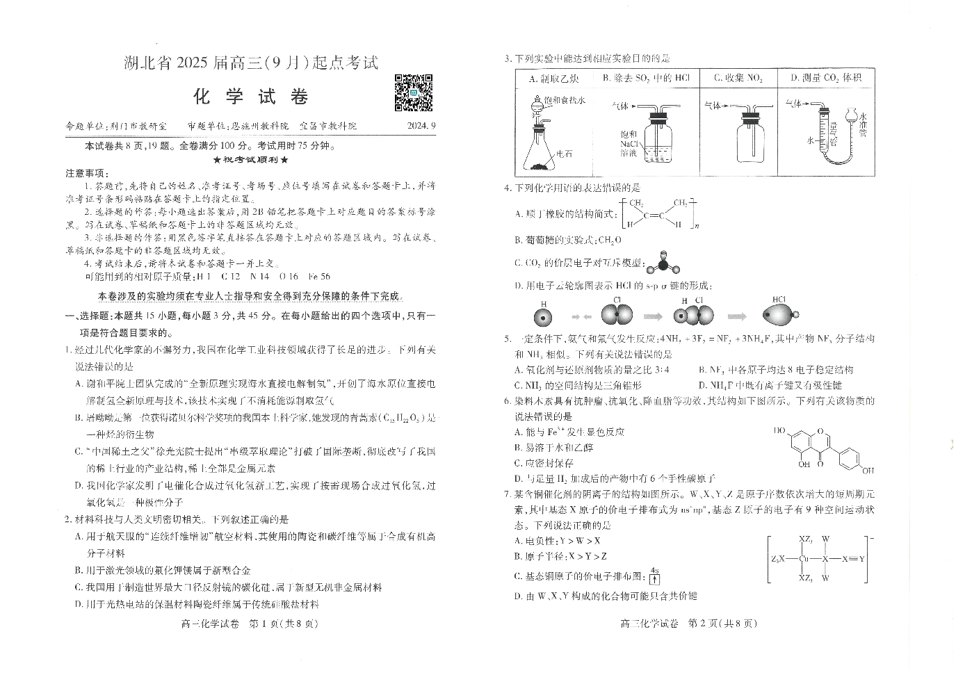湖北省“宜荆荆恩”2025+届高三9月起点考试+化学
