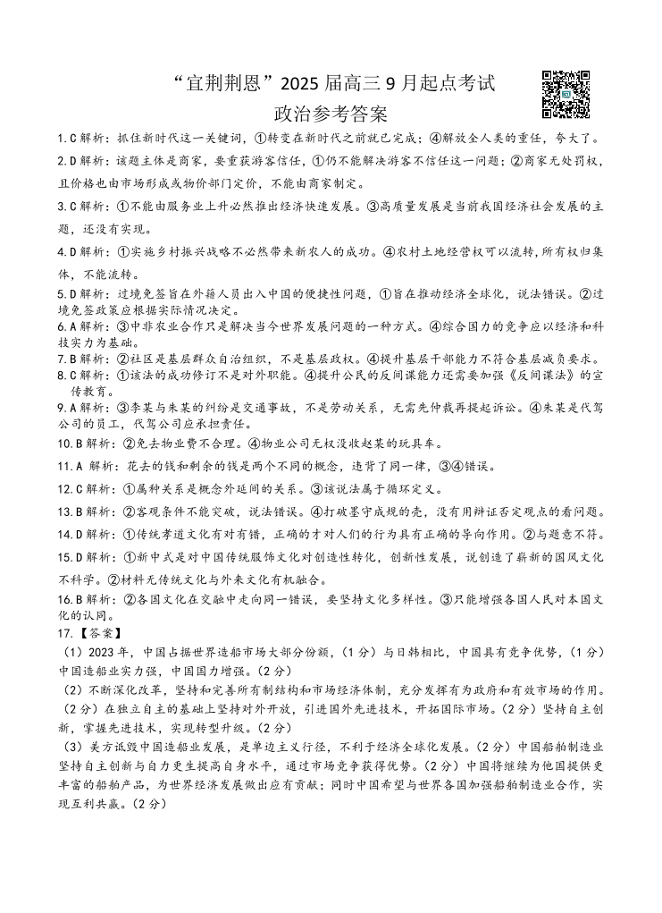 湖北省“宜荆荆恩”2025+届高三9月起点考试+思想政治答案