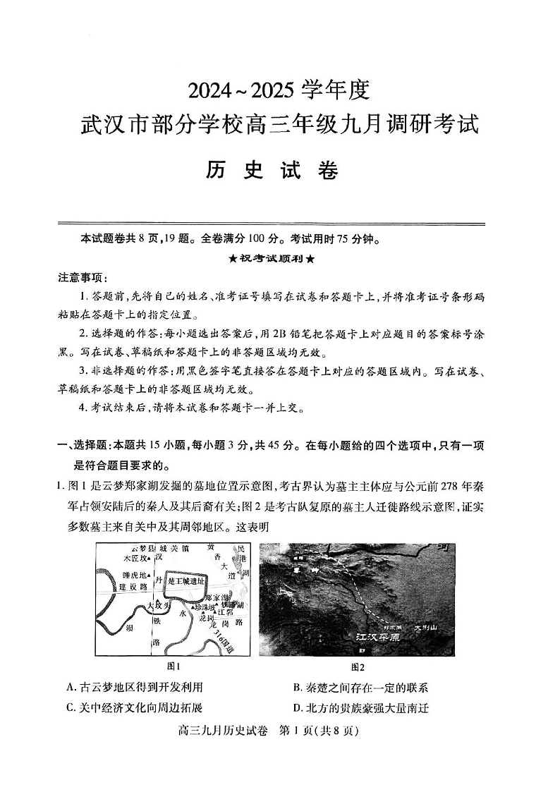 湖北省2024-2025学年度武汉市高三年级九月调研考试+历史