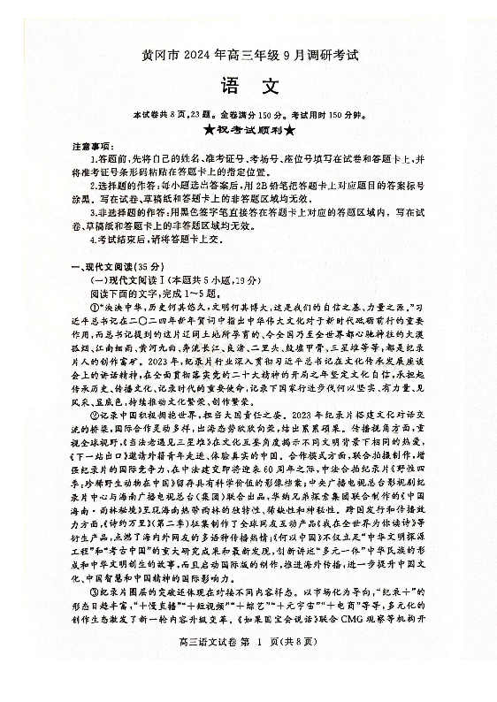 湖北省黄冈市2024年高三年级9月调研考试+语文