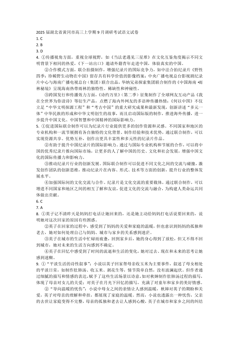 湖北省黄冈市2024年高三年级9月调研考试+语文答案