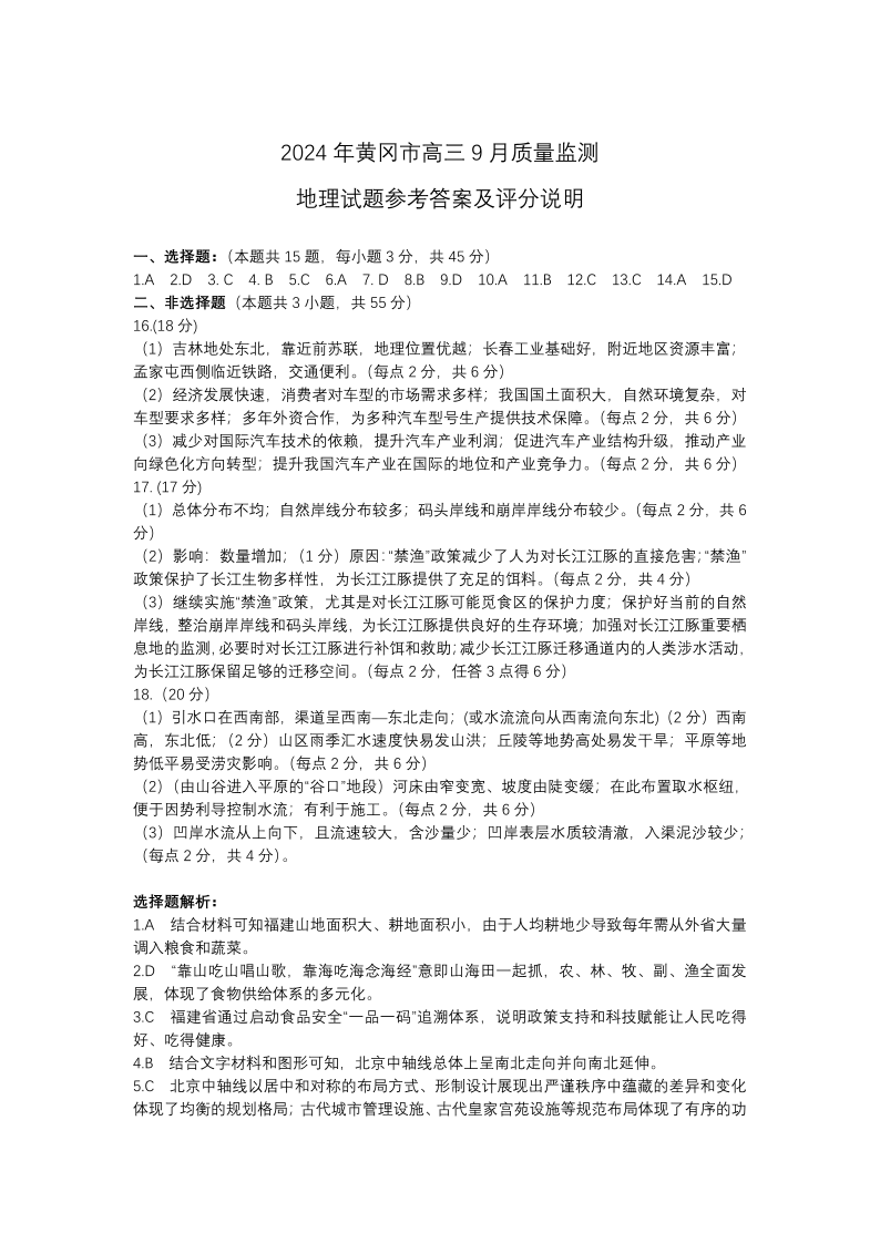 湖北省黄冈市2024年高三年级9月调研考试+地理答案