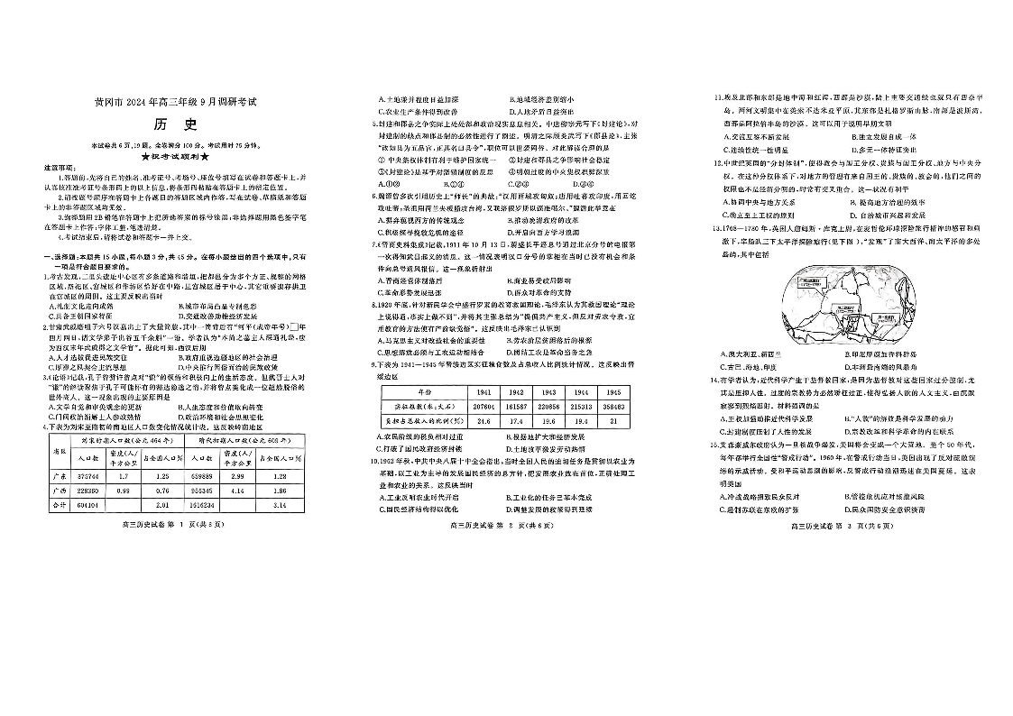 湖北省黄冈市2024年高三年级9月调研考试+历史