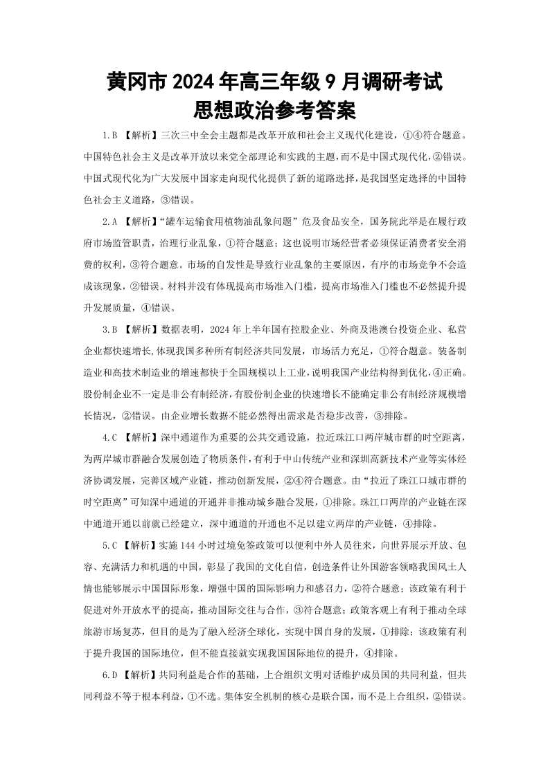 湖北省黄冈市2024年高三年级9月调研考试+政治答案