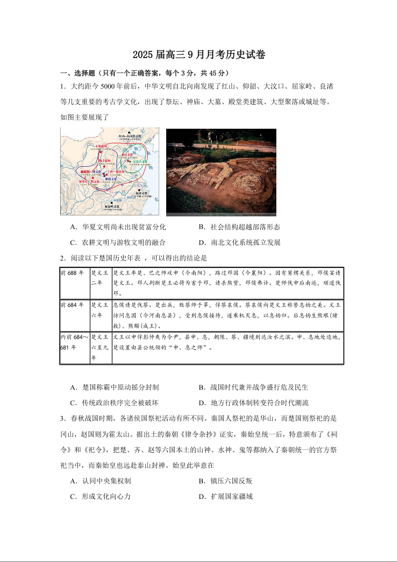 湖北省宜城市第一中学2024-2025学年高三上学期9月月考+历史