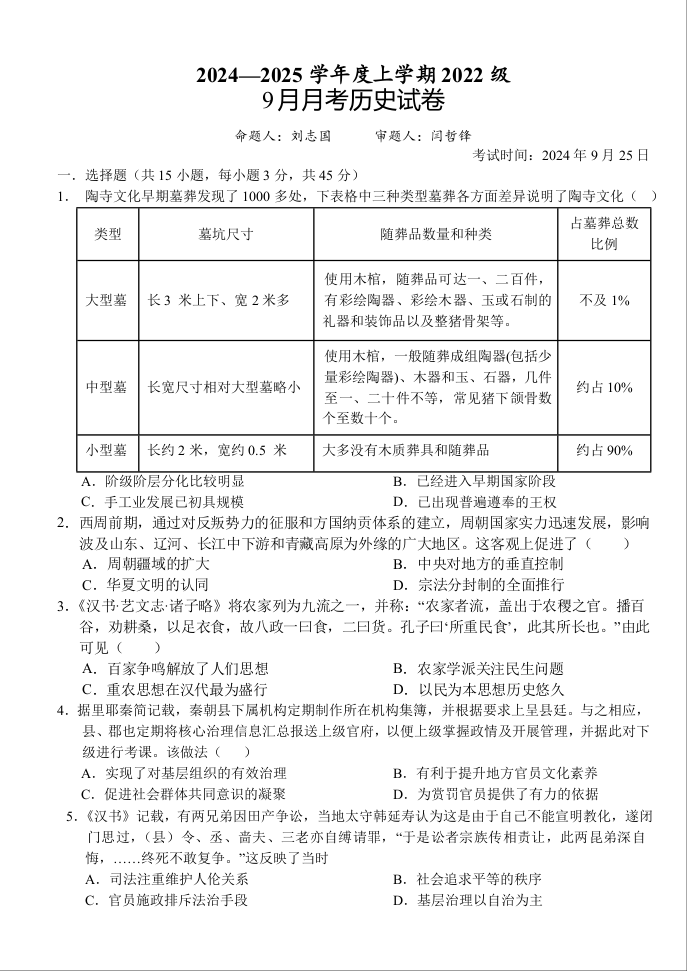 湖北省沙市中学2024-2025学年高三上学期9月月考试题+历史
