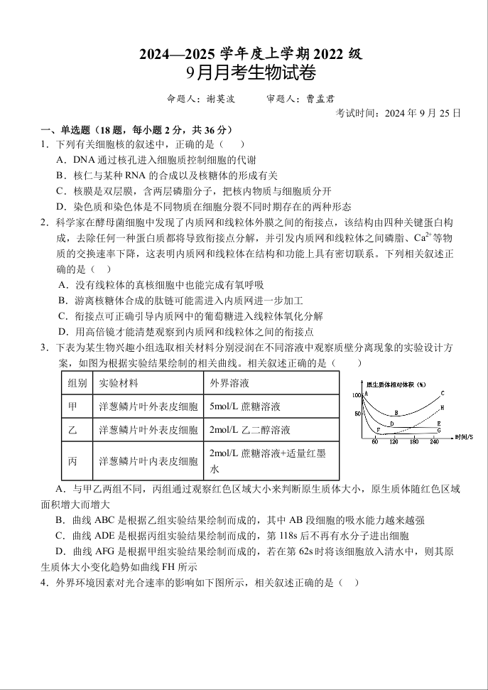 湖北省沙市中学2024-2025学年高三上学期9月月考试题+生物