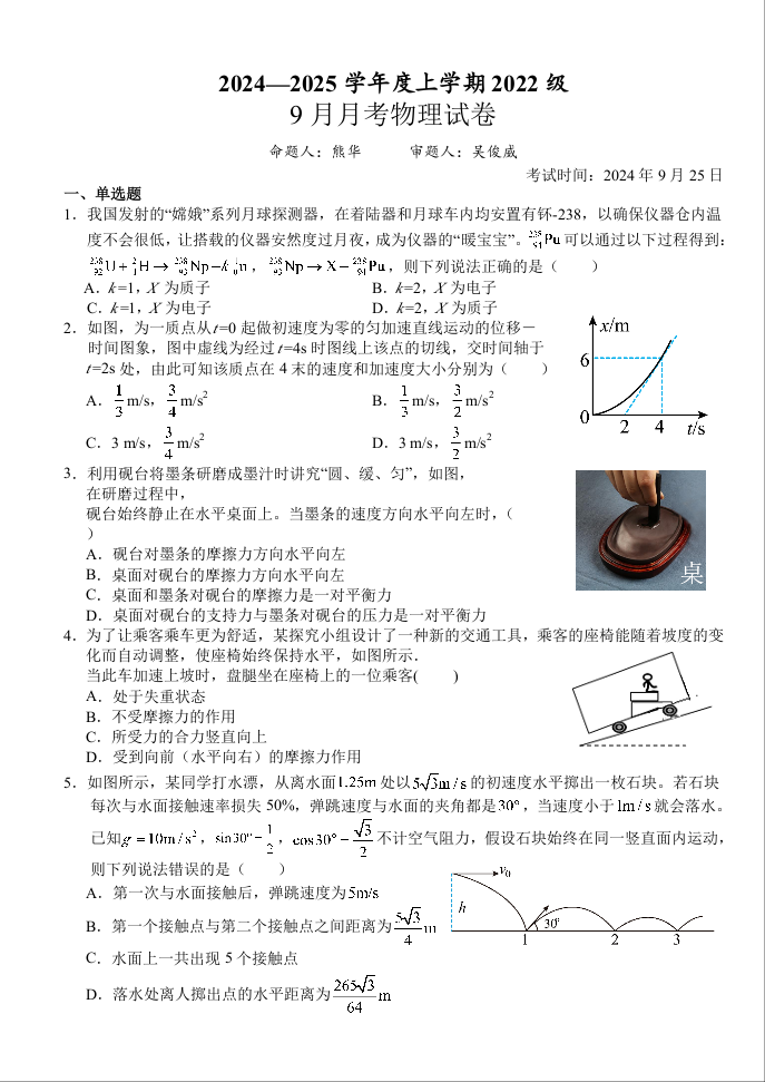 湖北省沙市中学2024-2025学年高三上学期9月月考试题+物理