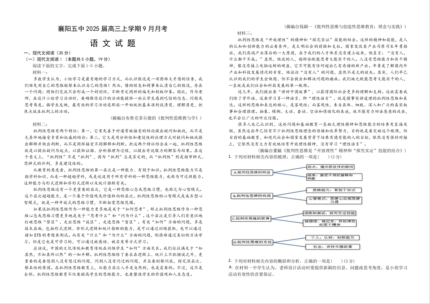 湖北省襄阳市第五中学2024-2025学年高三上学期9月月考+语文