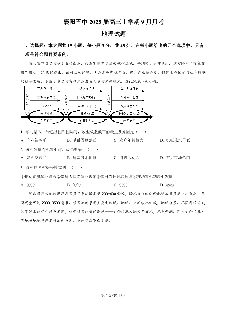 湖北省襄阳市第五中学2024-2025学年高三上学期9月月考+地理