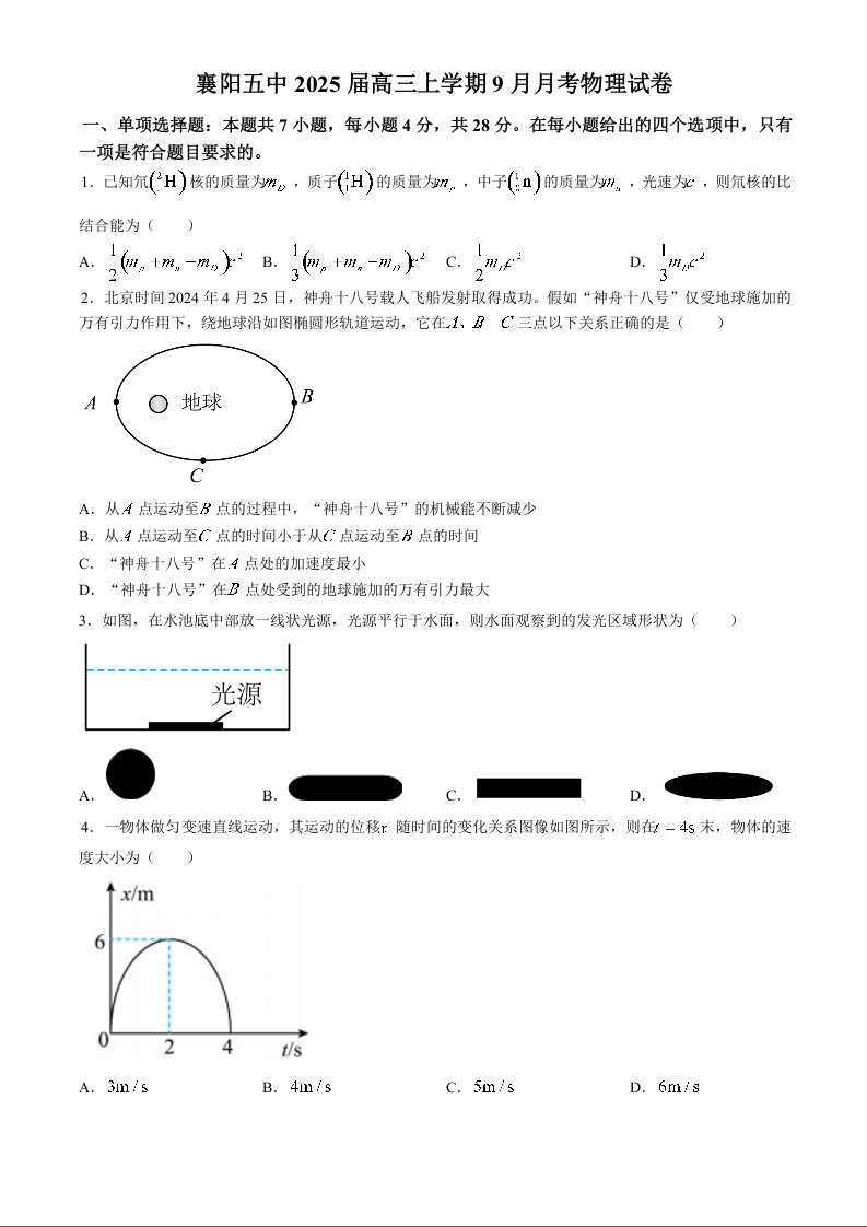 湖北省襄阳市第五中学2024-2025学年高三上学期9月月考+物理