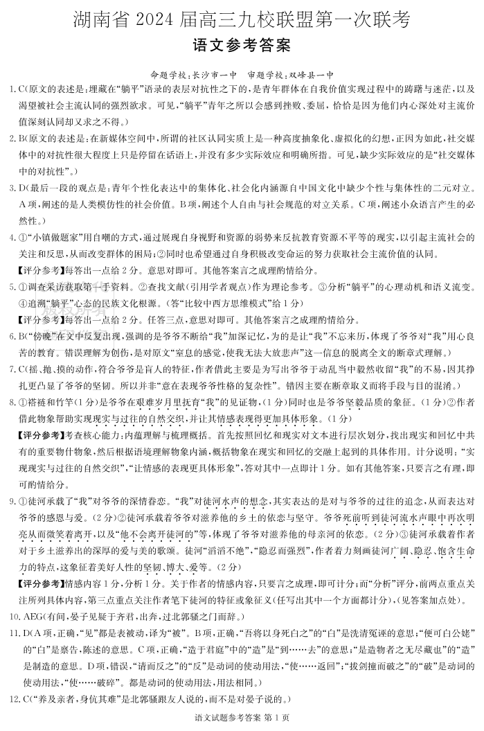 2024届湖南省湘东九校联盟高三上学期第一次联考(一模)语文答案