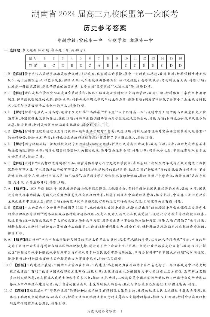 2024届湖南省湘东九校联盟高三上学期第一次联考(一模)历史答案