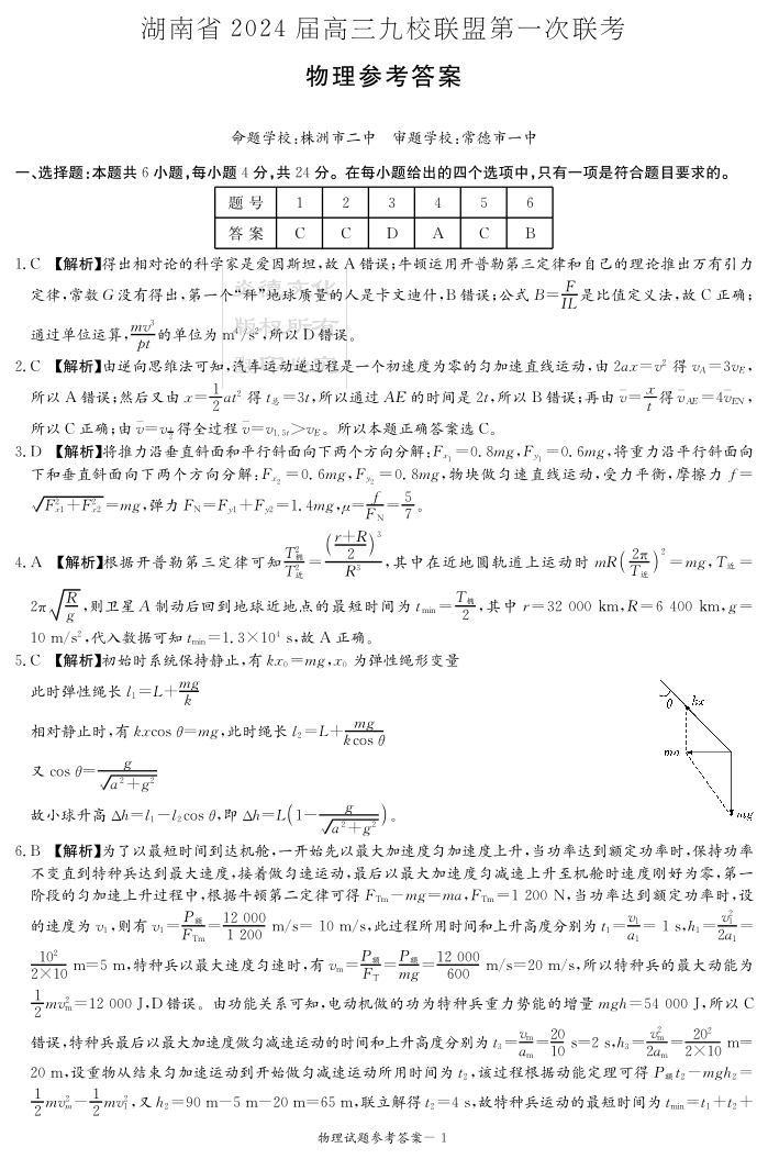 2024届湖南省湘东九校联盟高三上学期第一次联考(一模)物理答案