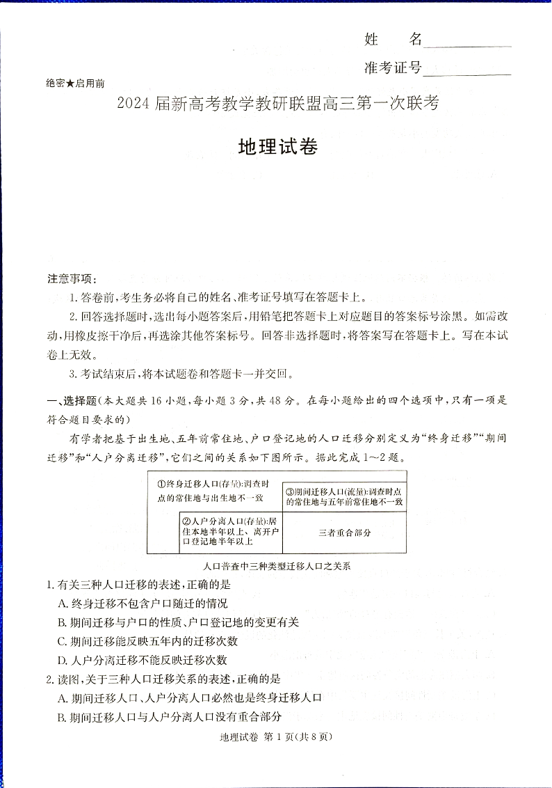2024届湖南省新高考教学教研联盟高三下学期第一次联考 地理