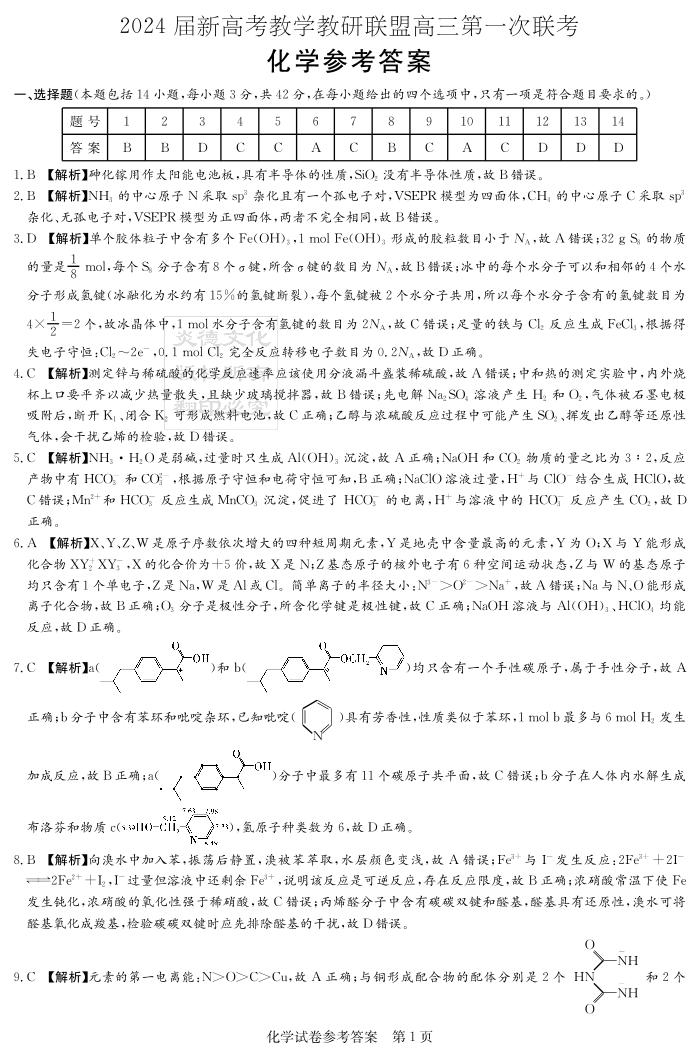 2024届湖南省新高考教学教研联盟高三下学期第一次联考 化学答案