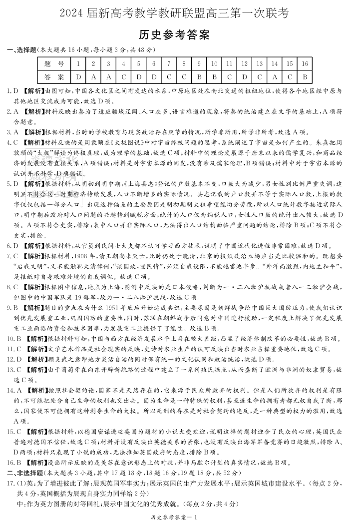 2024届湖南省新高考教学教研联盟高三下学期第一次联考 历史答案