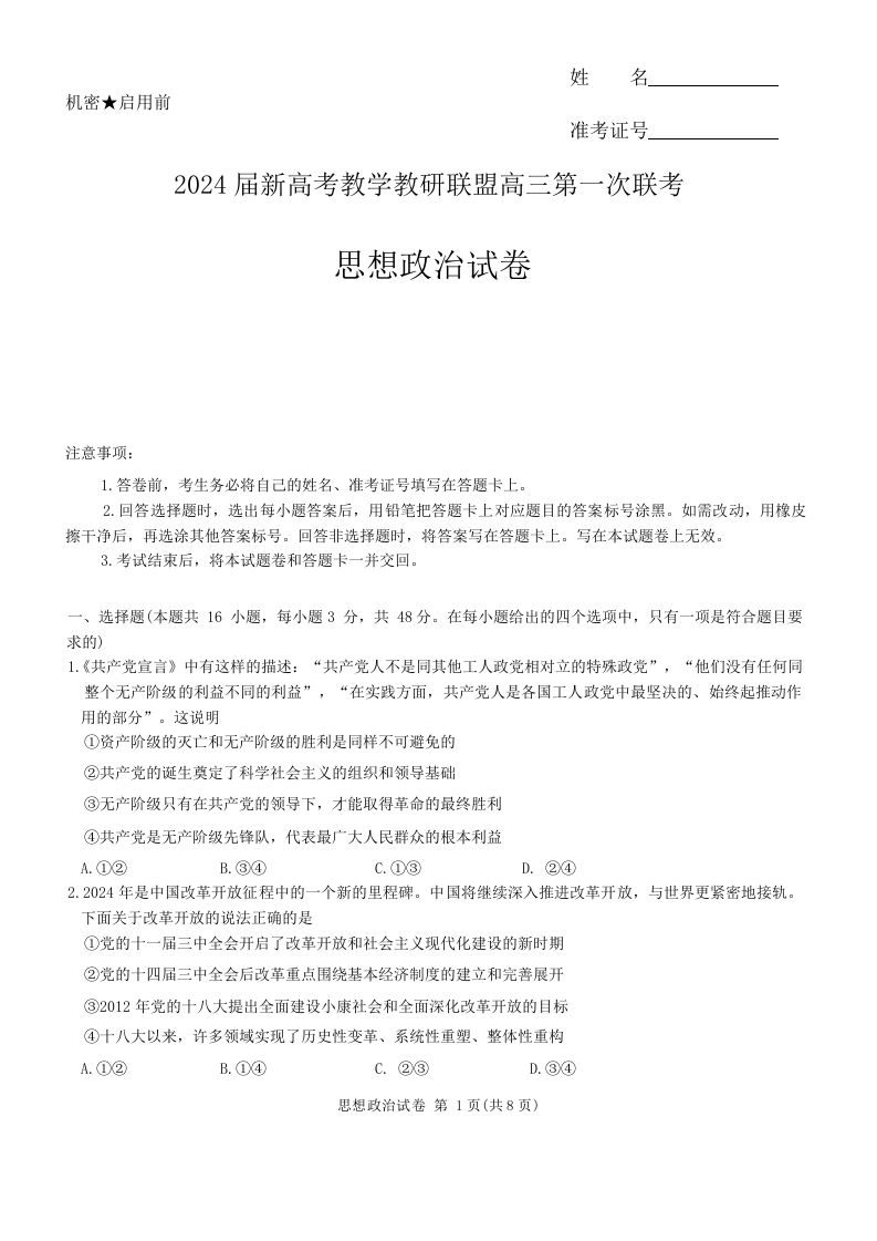 2024届湖南省新高考教学教研联盟高三下学期第一次联考 政治
