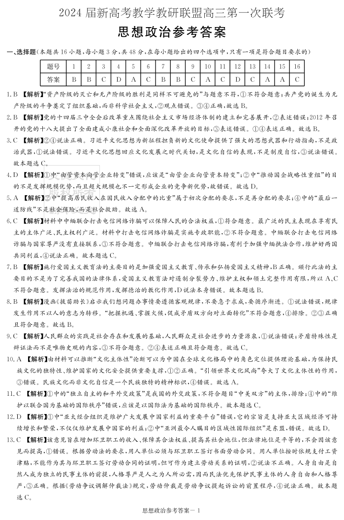 2024届湖南省新高考教学教研联盟高三下学期第一次联考 政治答案