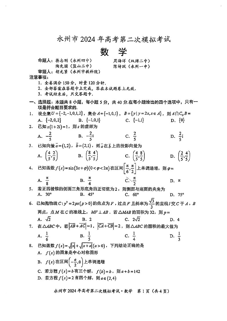 2024届湖南省永州市高三上学期第二次模拟考试 数学