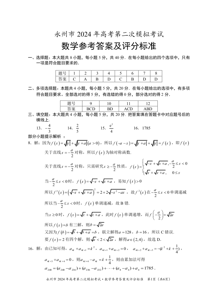 2024届湖南省永州市高三上学期第二次模拟考试 数学答案